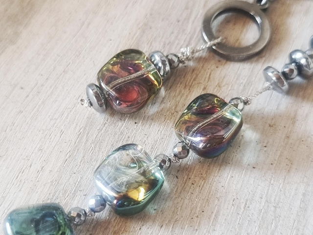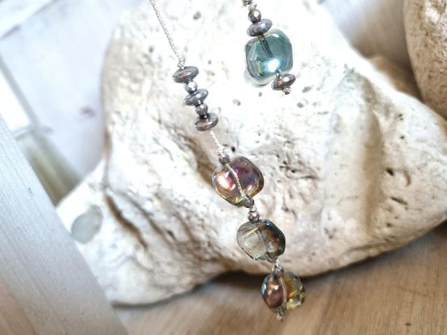 Boucles d'oreilles asymétriques en acier inoxydable et perles de verre.