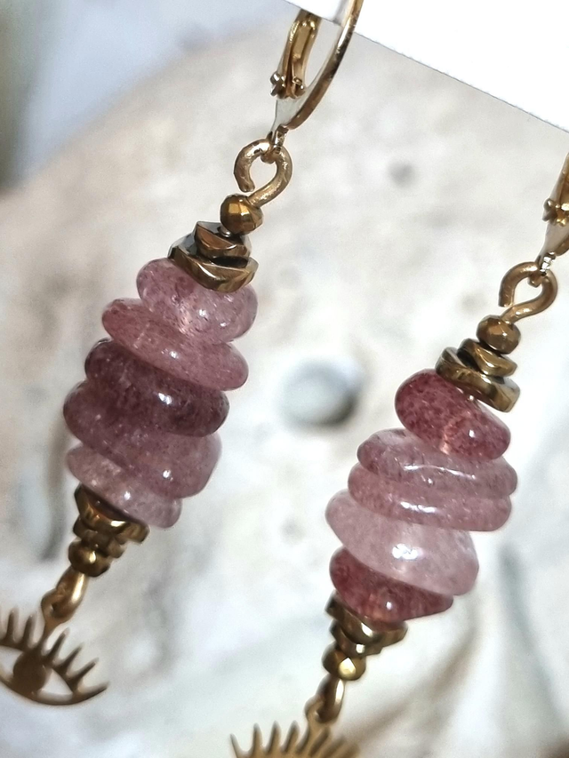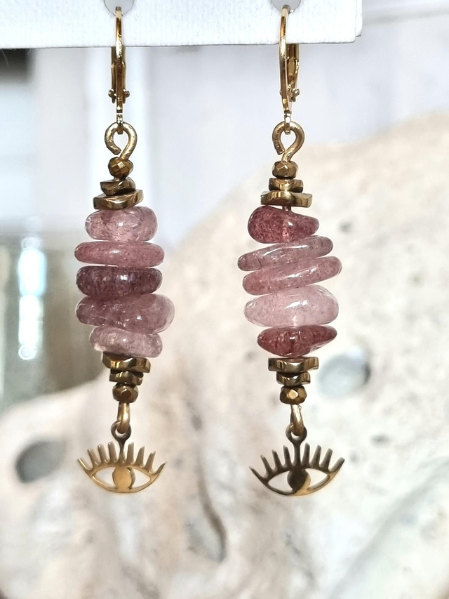 Boucles d'oreilles en laiton doré et pierre naturelle d'agate rose.