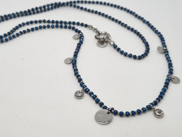 Collier sautoir pouvant être porté en bracelet 5 tours, en perles d'hematite bleu mat, breloques en acier inoxydable et fermoir mousqueton rond en acier.