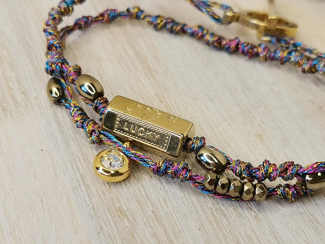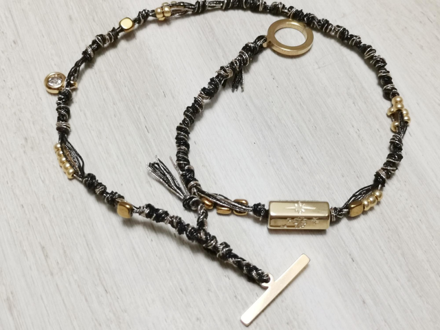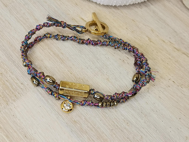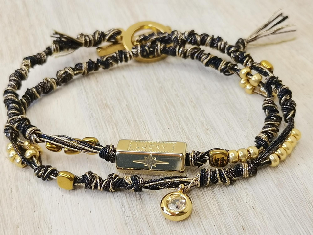 Bracelet double tour en fils métallisés, perle en acier inoxydable plaqué or, petites perles en hématites dorées, et breloque en acier plaqué or.