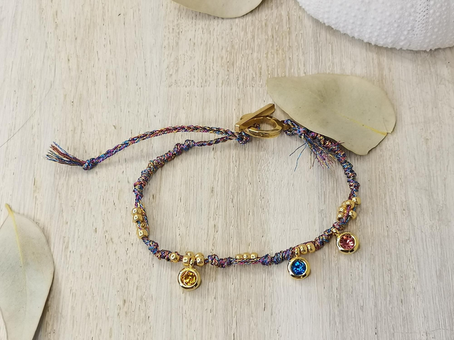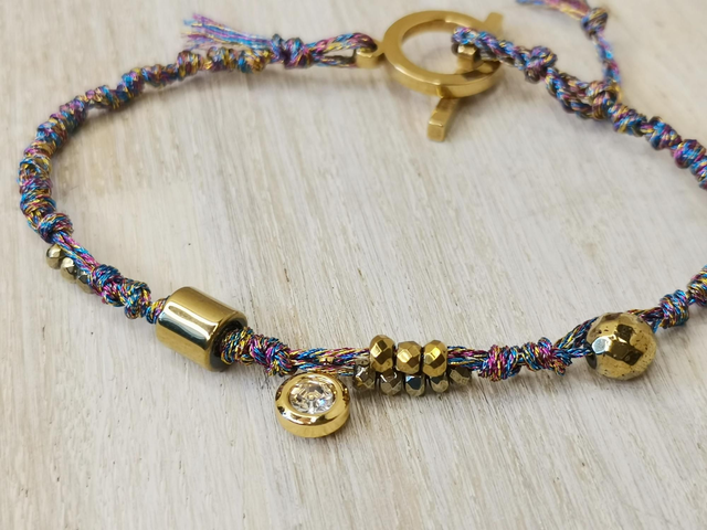 Bracelet en fils metallisés, perle à message en acier inoxydable plaqué or, perles hématites dorées, breloque acier plaqué or. Fermoir en T en acier plaqué or, reglable par nouage.