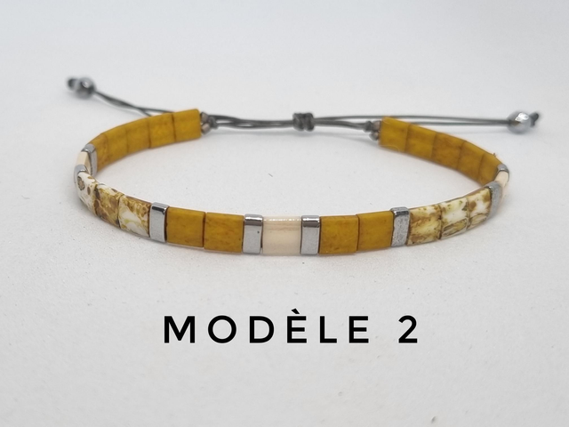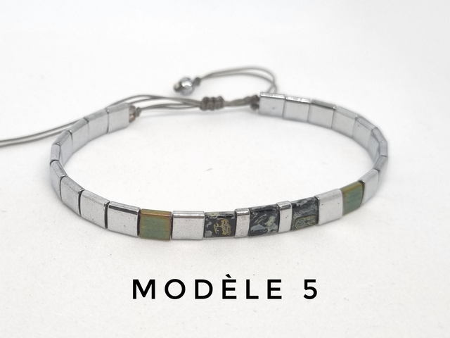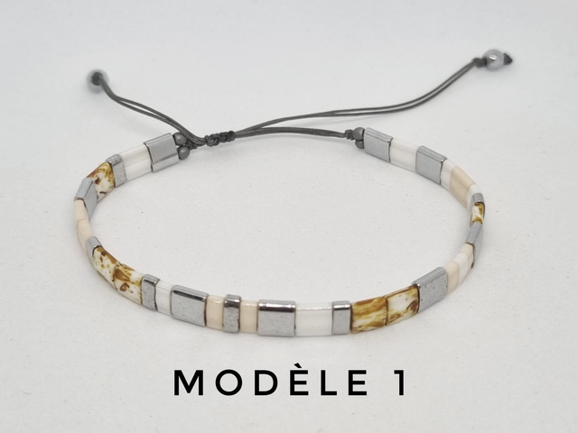 Bracelet en perles de verre Tila, et hématites argentées, réglable par coulissage.