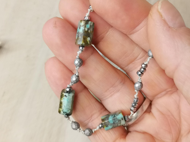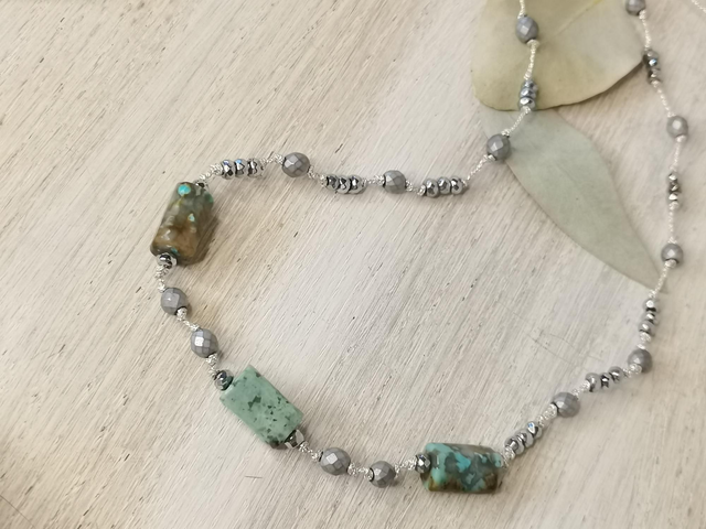 Collier sur fil métallisé argenté, perles en turquoise d'Afrique et perles hématites argentées. Fermoir en acier inoxydable. reglable par coulissage.