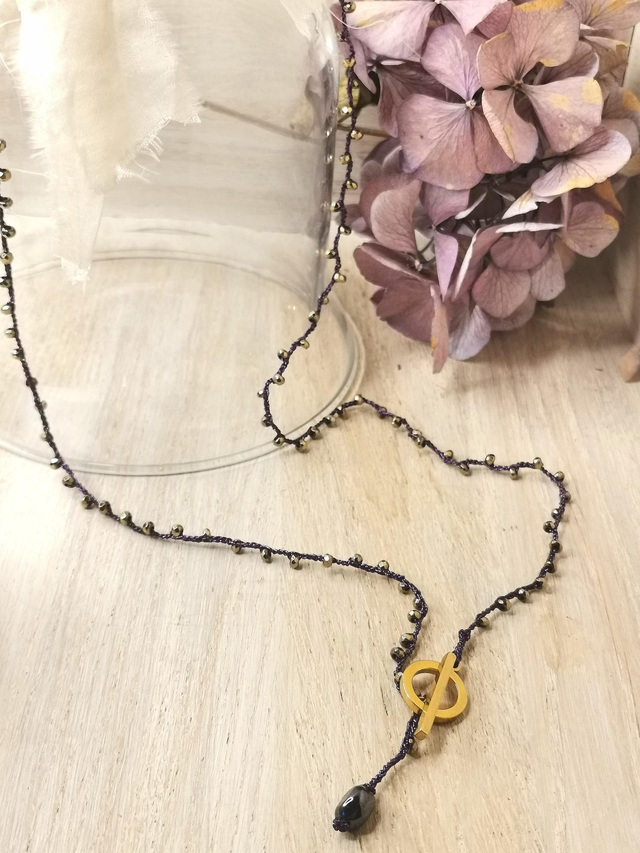 Collier pouvant se porter en bracelet 4 tours. Fil métallisé crocheté et perles hématites. Fermoir en acier plaqué or. 4 coloris possibles