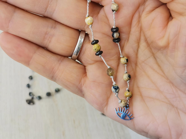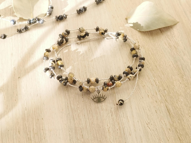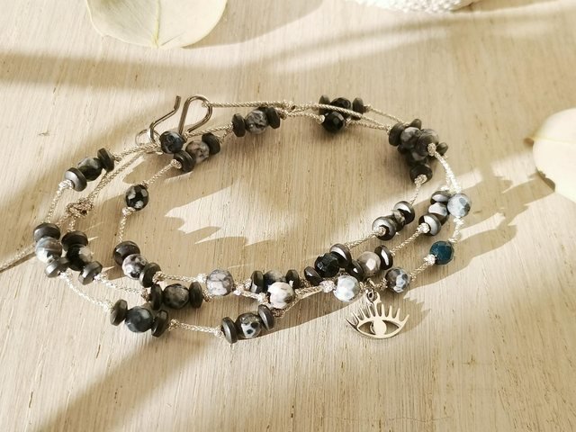 Collier/bracelet sur fil métallisé argenté, perles rondes en pierres naturelles, perles hématites anthracite. Réglable par coulissage.