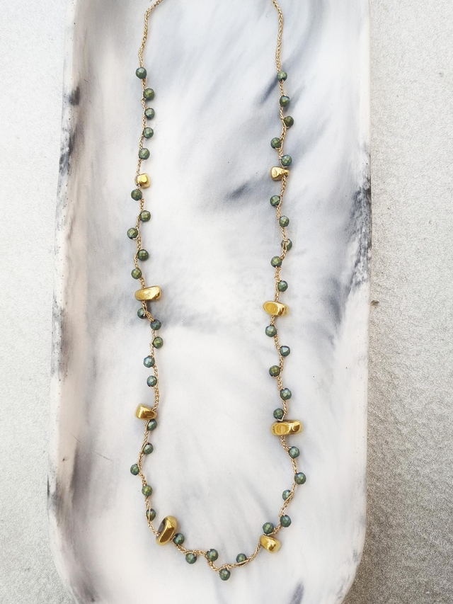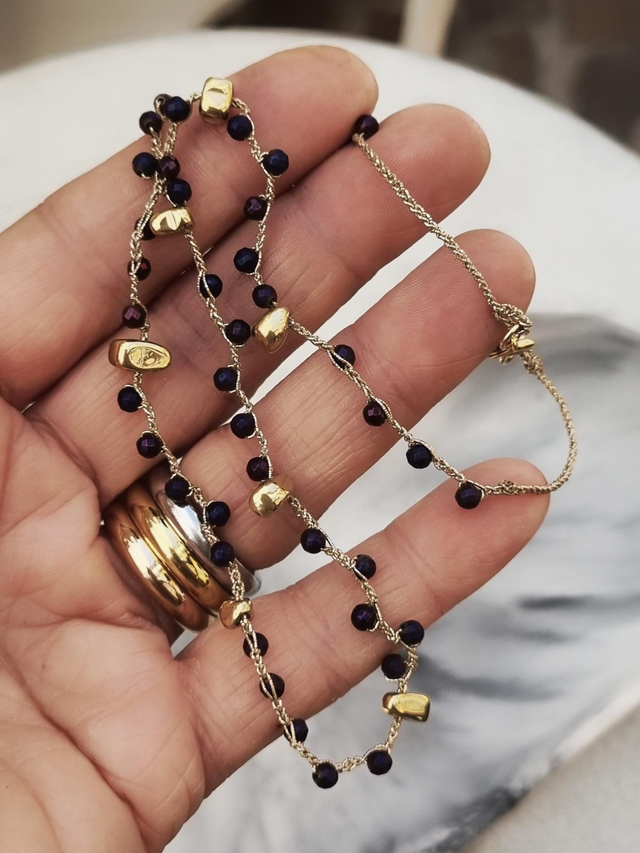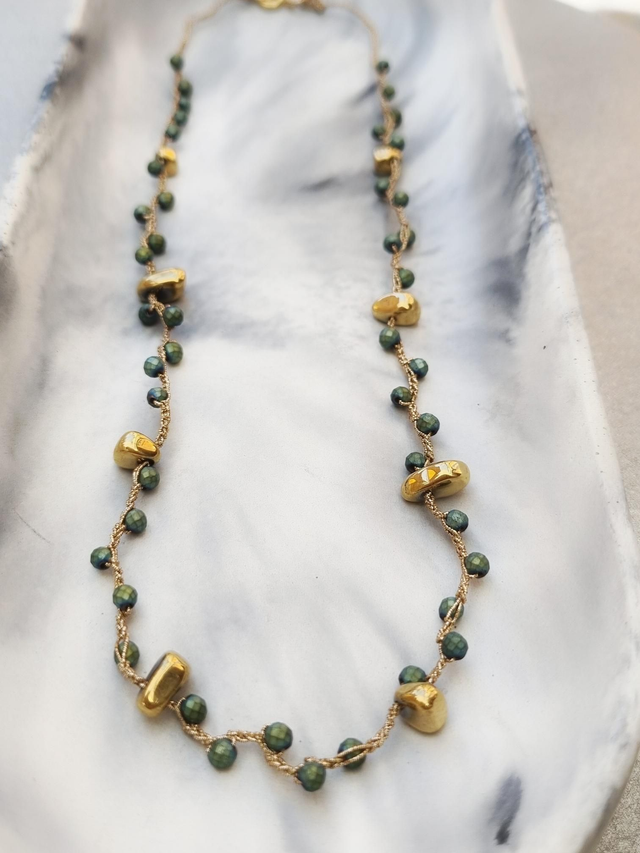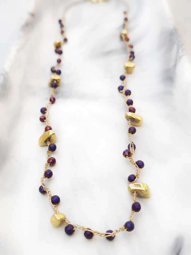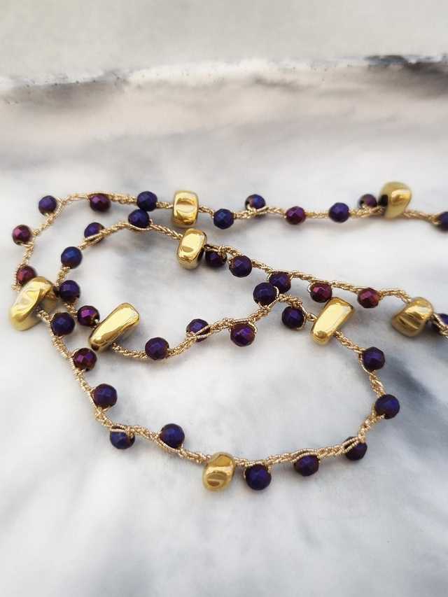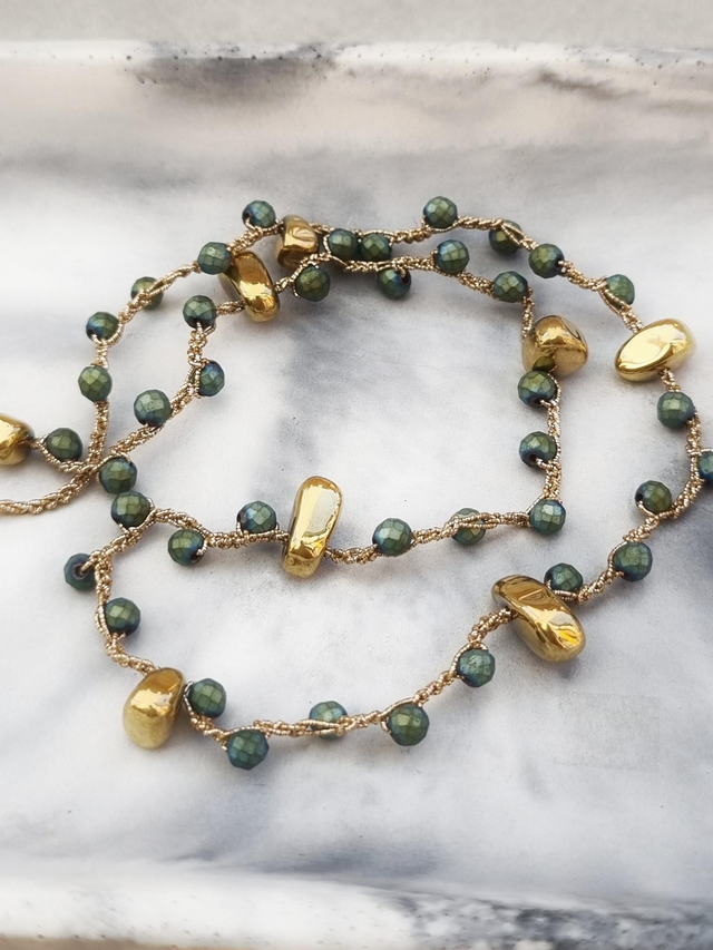 Collier au crochet en fil métallisé or, perles hématite mate verte ou violette. Hématite dorée. Fermeture par mousqueton doré.