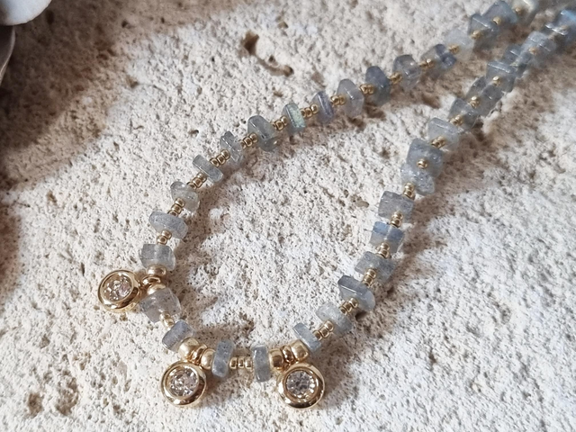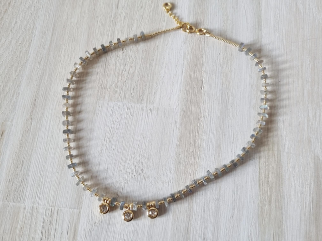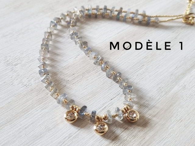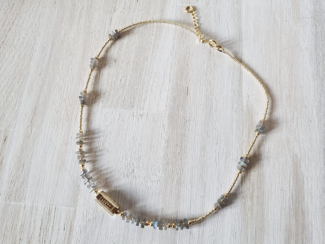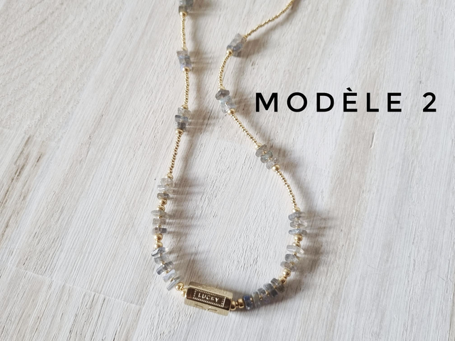 Collier en perles miyuki dorées et perles en pierre naturelles carrées plates, 2 couleurs: lapis lazuli et labradors, 4 modèles au choix.