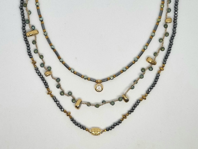 Collier en hématite noires, vertes et or, pendentif en acier plaque or. Fermeture réglable par coulissage.
