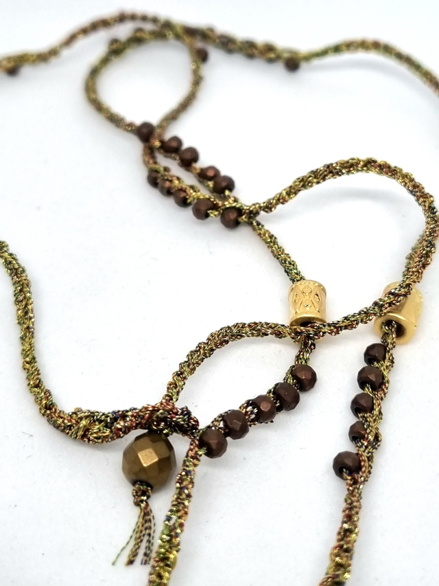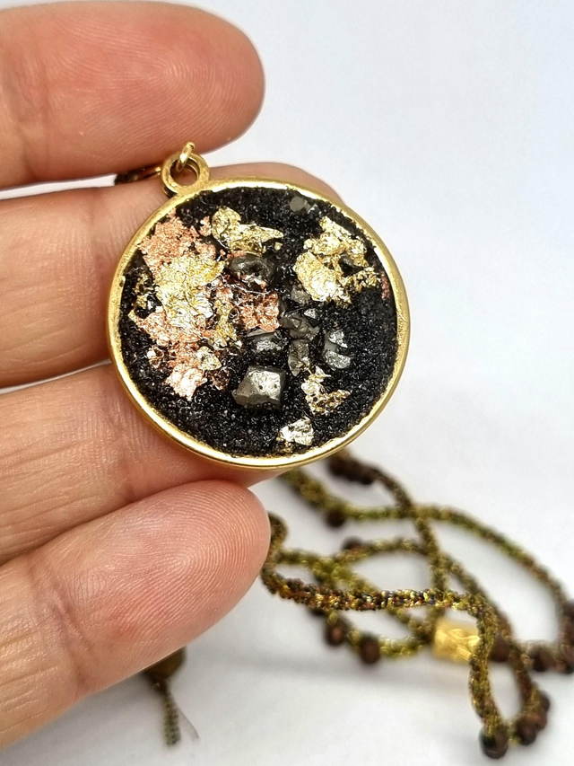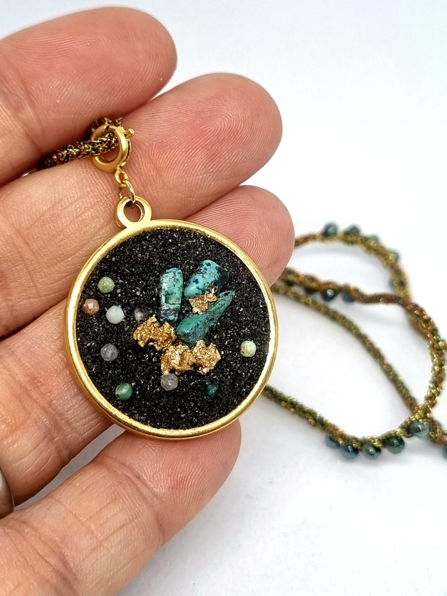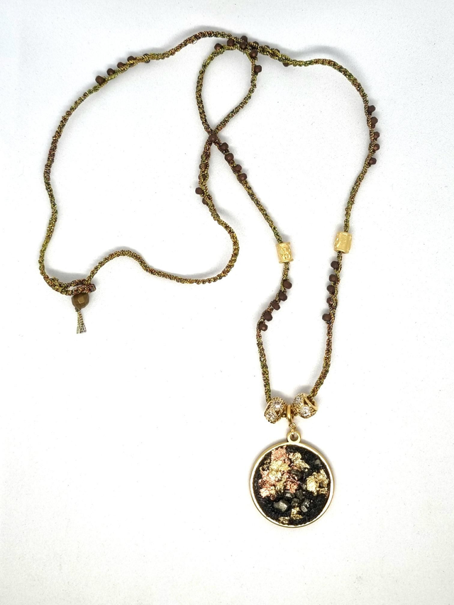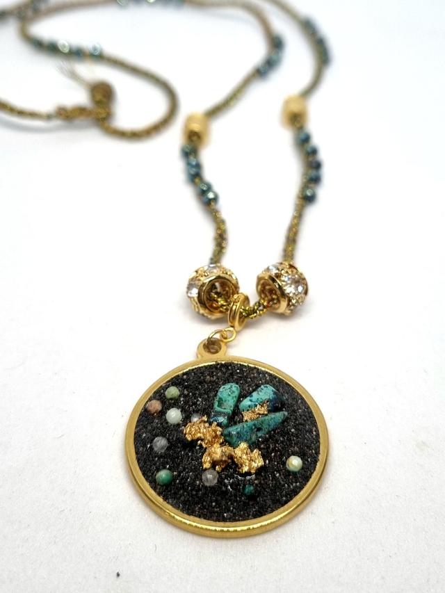 Collier mi long réalisé au crochet, fil métallisé et irisé, perles hématite et perles en laiton doré. Le pendentif à une base en acier inoxydable plaqué or, j'ai mis du sable de lave de Guadeloupe mélangé à de la résine, et j'y ai inséré des pierres naturelles et des feuilles cuivrées et dorées.