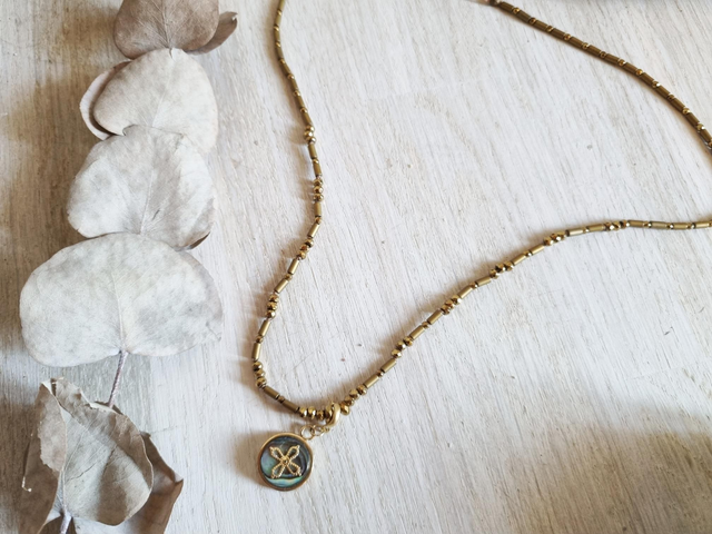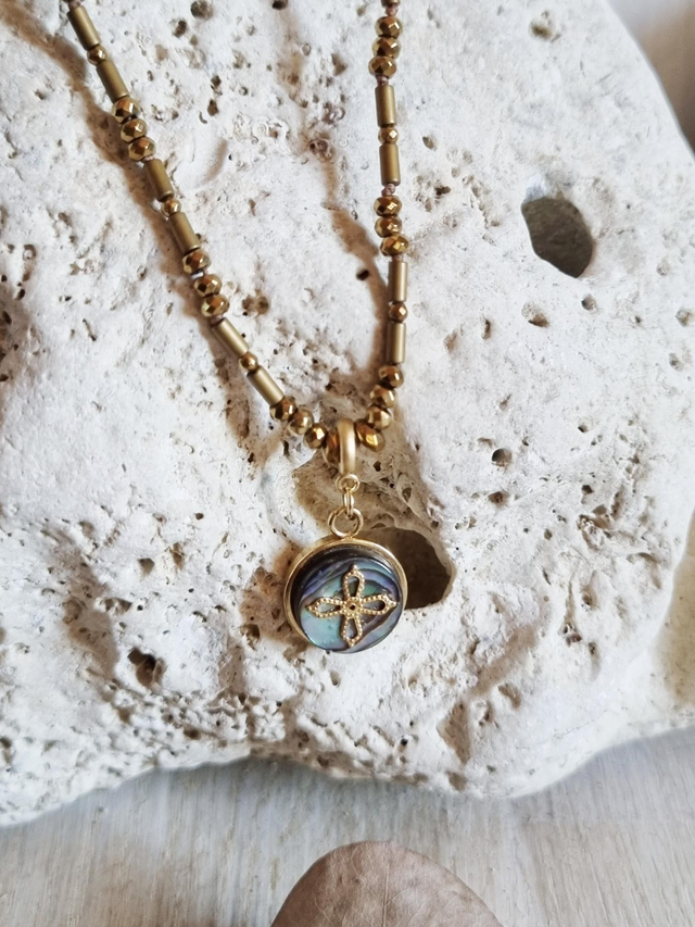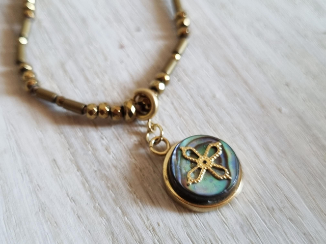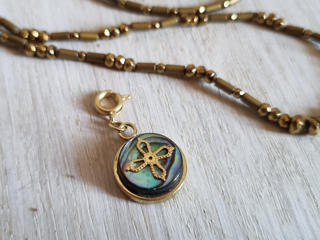 Collier en perles hématites dorées mates et brillantes, réglable par corsage. Pendentif amovible, en abalone et et support plaqué or.