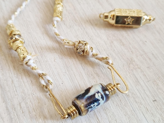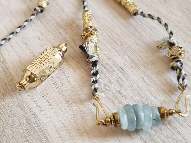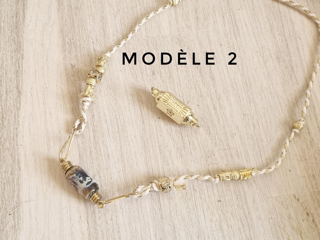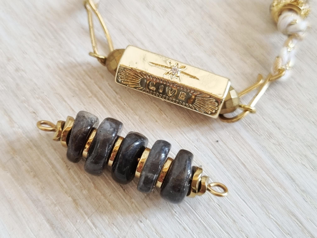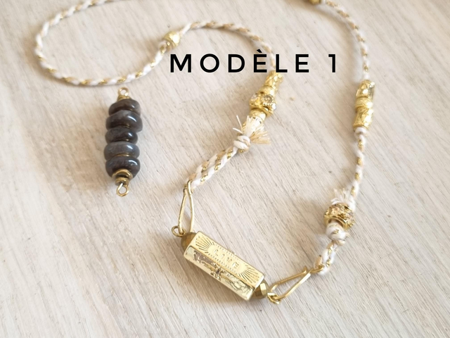 Collier en cordon de coton tressé doré, 2 couleurs. Beige et noir. Perles en laiton plaqué or, et 2 pendentifs, en pierre naturelles ou céramique, et laiton plaqué or avec inscription.