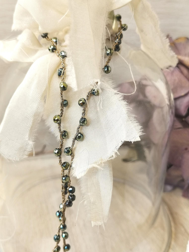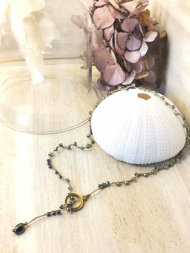 Collier au fil métallisé doré crocheté avec perles hématite bleu vert et anthracite. Fermoir en acier inoxydable plaqué or.