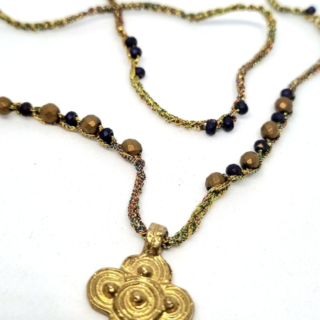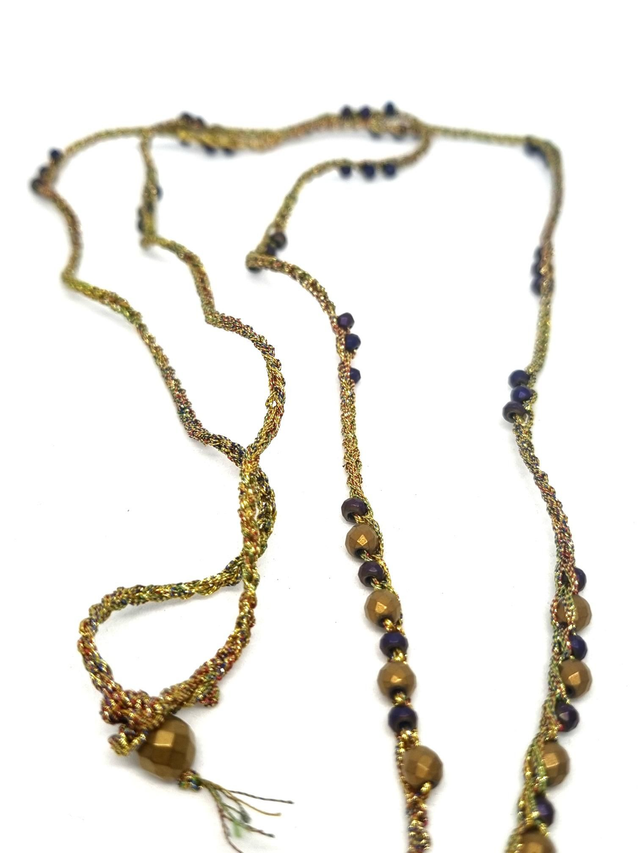 Collier réalisé entièrement au crochet, avec des perles en hématite de couleur or mat et prune mat. Le fil est métallisé et irisé grâce à l'association de fils de différentes couleurs lui donnant une impression de mordoré. Le pendentif est en laiton, fabriqué artisanalement en Inde.