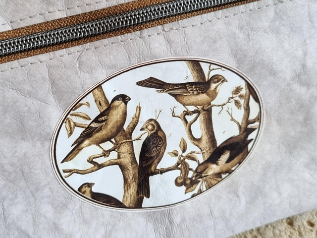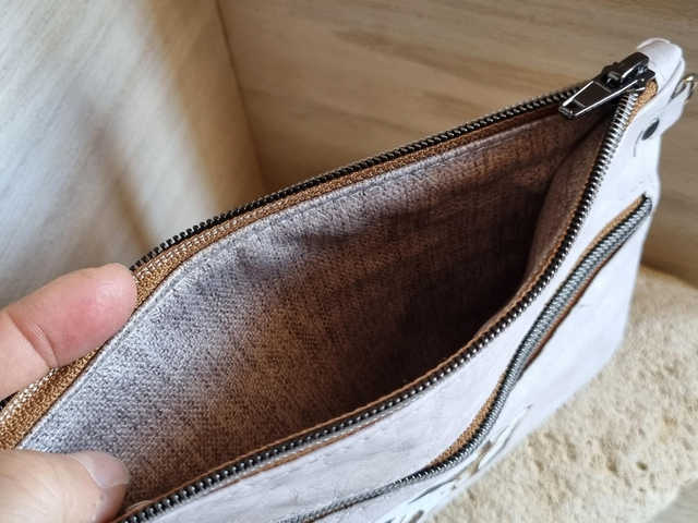 Trousse double poche, doublée tissu imperméable avec anneau sur le côté pour rajouter une anse ou l'attacher à l'intérieur d'un cabas. Modèle beige.