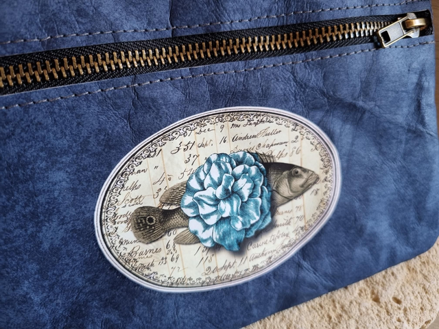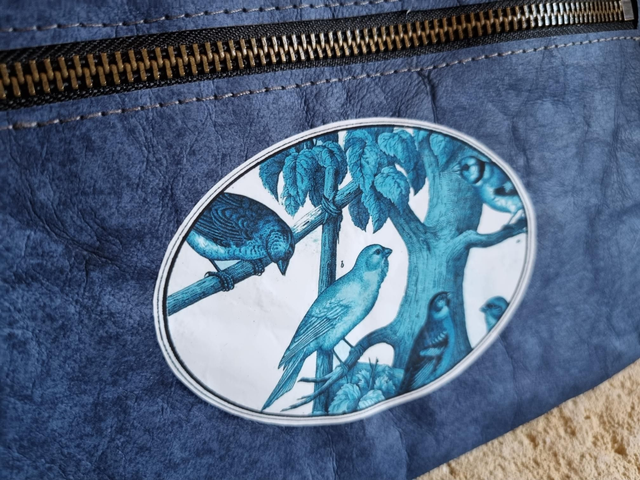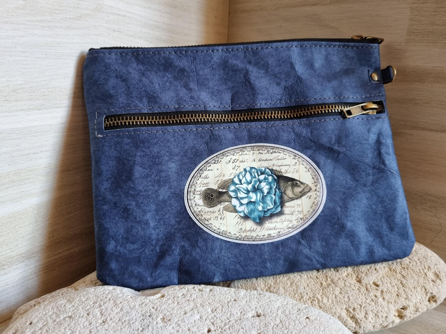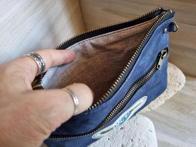 Trousse double poche, doublée tissu imperméable avec anneau sur le côté pour rajouter une anse ou l'attacher à l'intérieur d'un cabas. Modèle bleu.