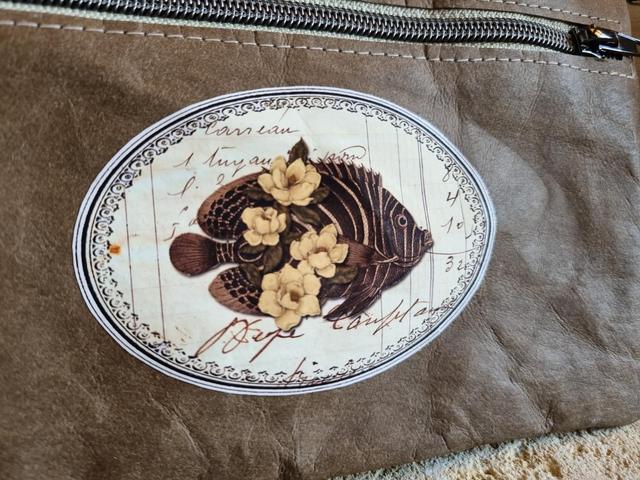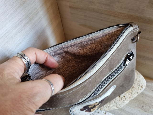 Trousse double poche, doublée tissu imperméable avec anneau sur le côté pour rajouter une anse ou l'attacher à l'intérieur d'un cabas. Modèle brun café