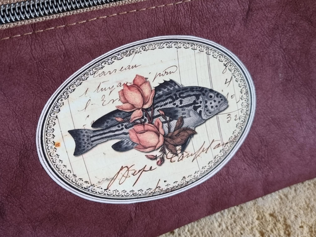 Trousse double poche, doublée tissu imperméable avec anneau sur le côté pour rajouter une anse ou l'attacher à l'intérieur d'un cabas. Modèle prune
