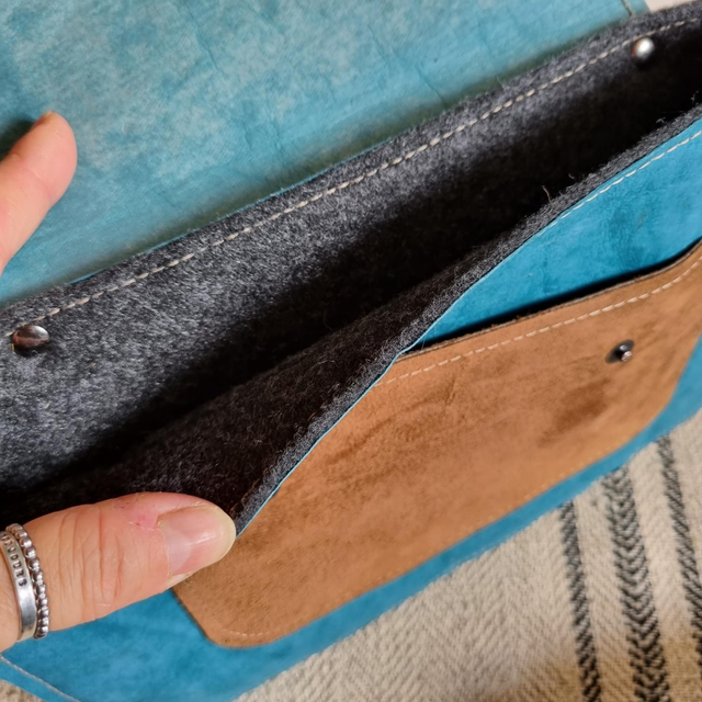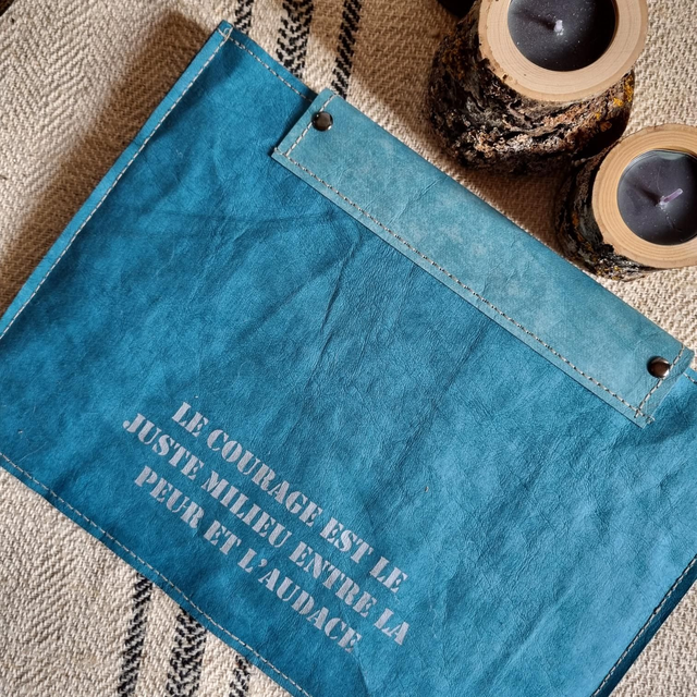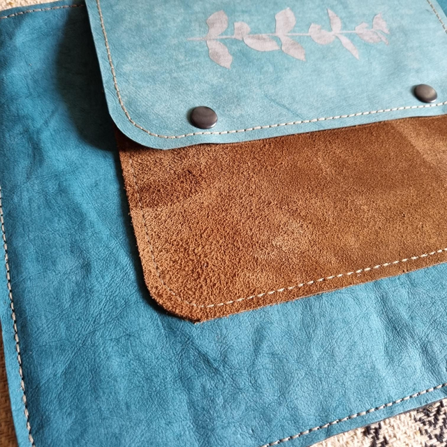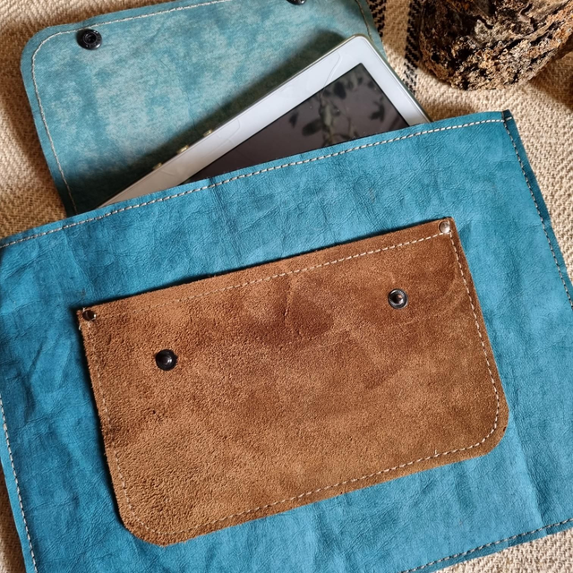 Housse de tablette en papier kraft et doublée en feutre gris, poche devant en cuir velours fauve, fermeture par boutons pression.