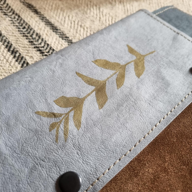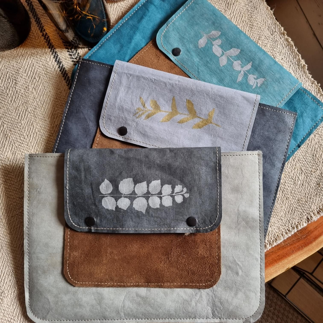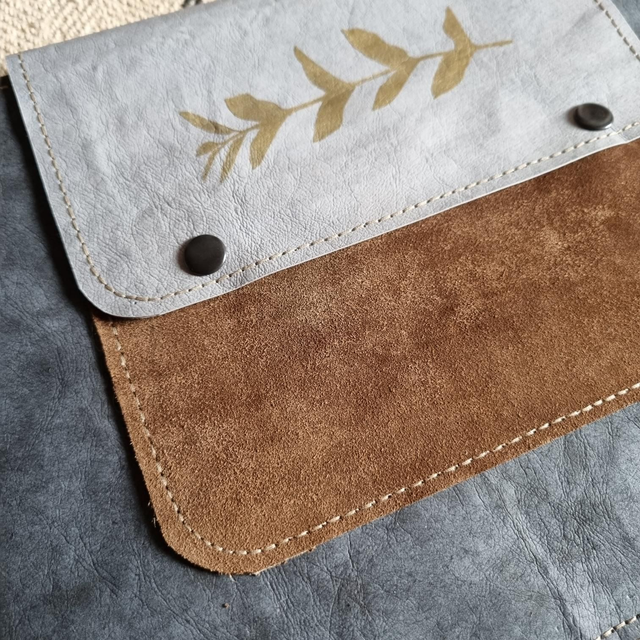 Housse de tablette en papier kraft et doublée en feutre gris, poche devant en cuir velours fauve, fermeture par boutons pression.