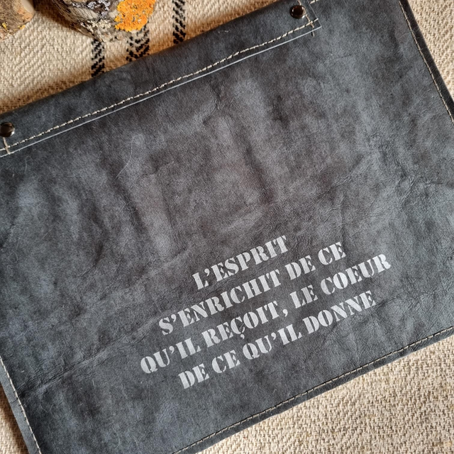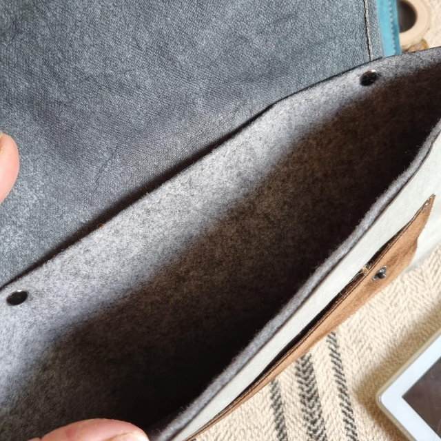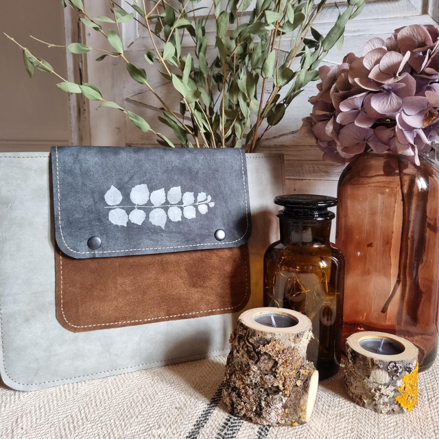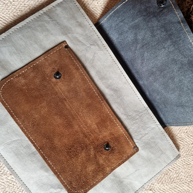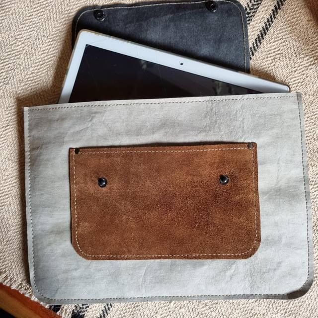 Housse de tablette en papier kraft et doublée en feutre gris, poche devant en cuir velours fauve, fermeture par boutons pression.