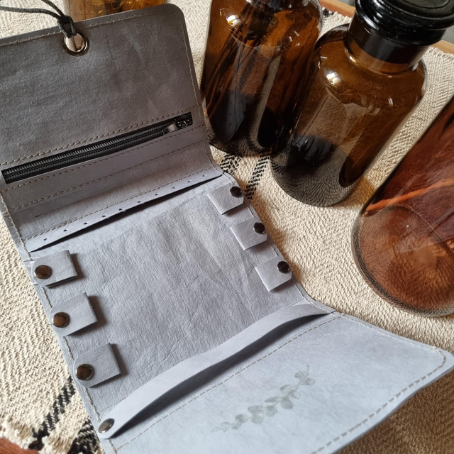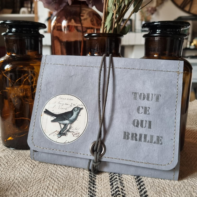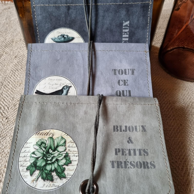 Pochette pour emporter vis bijoux partout avec vous. Réaliser entièrement en papier kraft teinté en gris bleuté. Existe en d'autres coloris.