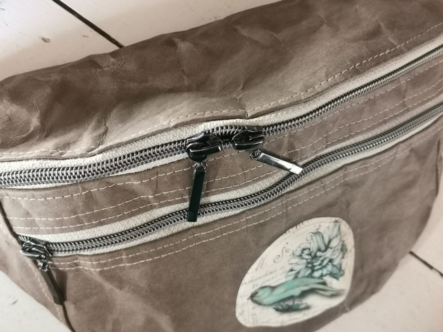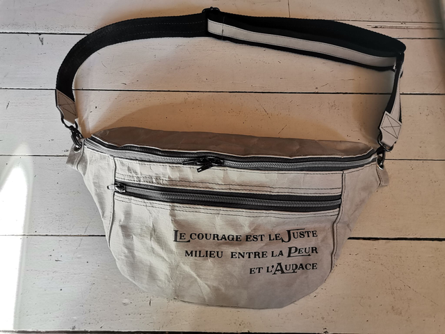 Sac banane à porter en bandoulière, 2 poches zippées et une poche intérieure. Doublure en tissu enduit.