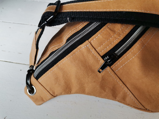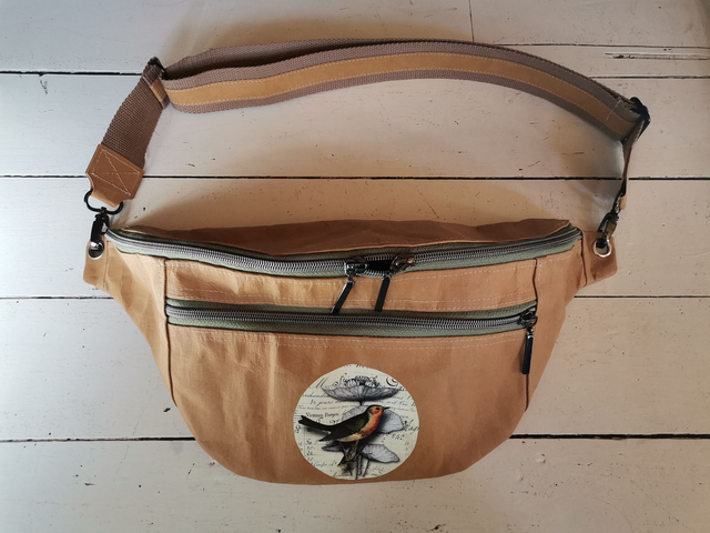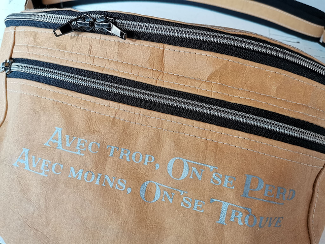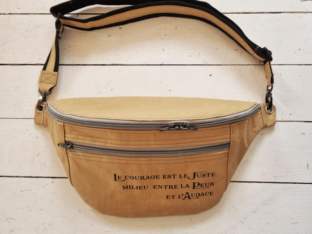 Sac banane à porter en bandoulière, 2 poches zippées et une poche intérieure. Doublure en tissu enduit.